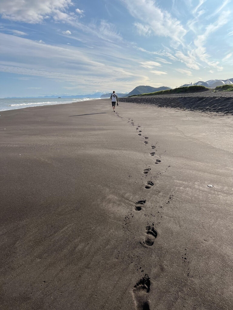 Камчатское место силы - легендарный пляж с черным вулканическим песком и видом на вулканы, который входит в топ-100 лучших пляжей на планете! Это место должен посетить каждый гость Камчатки: почувствовать мощь океана, встретить рассвет, а возможно и попробовать серфинг, ведь волны тут не редкость. Также если двигаться вдоль океана направо до скалистых утёсов, можно насладиться завораживающими пейзажами с высоты.